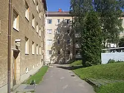 Sofianlehdonkatu 9's courtyard (2015); the cellar is located between stairwells A and B in the foreground.