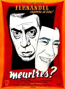 Murders (French: Meurtres) is a 1950 French drama film directed by Richard Pottier and starring Fernandel, Mireille Perrey and Jacques Varennes.[1] [2] The film is adapted from a series of five novels by Belgian writer Charles Plisnier, published between 1939 and 1941. It marked a rare dramatic role for the comedian Fernandel. It was shot at the Neuilly Studios in Paris. The film's sets were designed by the art director Paul-Louis Boutié. The title is also written as Murders? (French: Meurtres?).