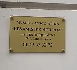 The Musée Édith Piaf is a private museum dedicated to singer Édith Piaf located in the 11th arrondissement at 5, rue Crespin du Gast, Paris, France. It is open by appointment; admission is free.[1]