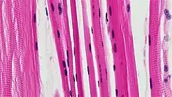 ![]() Three distinct types of muscle (L to R): smooth (non-striated), cardiac, and skeletal muscle | |