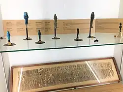 The Egyptian collection, begun around 1845,[14] is made up of two mummies (one intact female and one male of which only the head is possessed) and objects from funerary contexts: ushabti, a papyrus from Amduat,[15] which recounts the nocturnal journey of the Sun and figures in painted wood recomposed under restoration in an inlaid mummy board, almost unique in the Italian Egyptological collections.[16] Extraneous to the Egyptian world is the clay figurine, of Syrian origin, datable between 2000 and 1800 BC.[17]