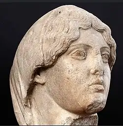 The series of marble sculptures largely dates back to Aldini's acquisitions, including the most valuable piece in the collection, the splendid female head, a Roman replica of the Aphrodite Sosadra of Calamis.[2] Also in the same collection a group of Roman marble statues from Velleia was enriched.[3][4] Of remarkable quality is a private female portrait of the imperial age assigned to the second half of the 2nd century AD. Interesting for the history of the circulation of forgeries in the antiquarian trade is the presence of some pieces of modern execution, including an eighteenth-century copy of a portrait in the National Museum of Naples, long considered to be a Hellenistic original.