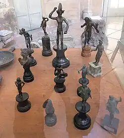 The original nucleus of the collection also includes architectural elements, epigraphs (including two inscriptions on bronze lamina with medical prescriptions found at Vernavola[5]) and objects belonging to different classes of artefacts (ceramics, glass, metal objects, gems and rings), acquired, also locally, with the aim of offering students an effective sampling of the material culture of antiquity, understood in the modern way as a source for ancient history. The small bronzes are represented by a series of statuettes of divinities from different cultural areas (Egypt, Magna Graecia, Etruria, the Roman world): alongside types derived from the great statuary of classical Greece, typically Roman figures are represented, such as the statuettes of Lares, expression of the domestic cult. From the purchase in 1831 of the collection of the Milanese sculptor Giovanni Battista Comolli come a series of painted vases of Apulian production (4th century BC) and a small group of black-glazed Ware pottery attributable to Etruscan and southern Italic factories. In 1845 there was already a small collection of Egyptian and oriental material.[6]
