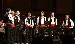 The klapa music is a form of a cappella singing that first appeared in littoral Croatia during the middle of the 19th century.[3] The word klapa is derived from a word in slang Italian spoken in Trieste at the time. It refers to "a group of people" and the singing style traces its roots to liturgical church singing. The motifs, in general, celebrate love, wine (grapes), country (homeland) and sea. The main elements of the music are harmony and melody, with rhythm very rarely being very important.