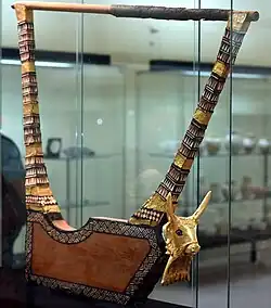 In 1929, archaeologists led by the British archaeologist Leonard Woolley, representing a joint expedition of the British Museum and the University of Pennsylvania Museum of Archaeology and Anthropology, discovered the Lyres of Ur or Harps of Ur, which are considered to be the world's second oldest surviving stringed instruments when excavating the Royal Cemetery of Ur between from 1922 and 1934.[1] They discovered pieces of three lyres and one harp in Ur, located in what was Ancient Mesopotamia, modern day Iraq.[2][3] They are over 4,500 years old,[4] from ancient Mesopotamia during the Early Dynastic III Period (2550–2450 BC).[5] The decorations on the lyres are fine examples of the court art of Mesopotamia of the period.[5]