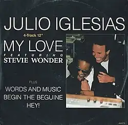 "My Love" is a song performed by Spanish singer/songwriter Julio Iglesias, written by and featuring American musician Stevie Wonder. It was released as a single in 1988 from Iglesias' album, Non Stop. The duet was a top 5 hit in the UK[1] and Ireland,[2] reaching numbers 5 and 2, respectively. In the U.S., it reached No. 80 on the Billboard Hot 100,[3] and No. 14 on the Adult Contemporary chart.[4]