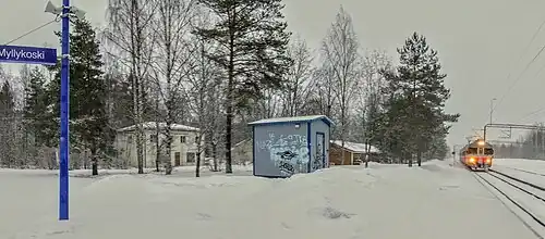 The Myllykoski railway station (Finnish: Myllykosken rautatieasema, Swedish: Myllykoski järnvägsstation) is located in the town of Kouvola (formerly the municipality of Anjalankoski), Finland, in the urban area of Myllykoski. It is located along the Kouvola–Kotka railway, and its neighboring stations are Kouvola in the north and Inkeroinen in the south.