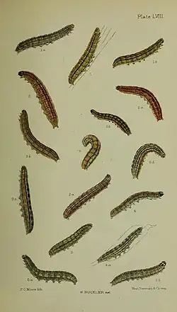 Larva dull yellow brown; dorsal line white, with dark edges: subdorsal line black; lateral lines white flecked with red, with a broad brown stripe running beneath them and above the black spiracles.[5] See also Hacker et al.[6]