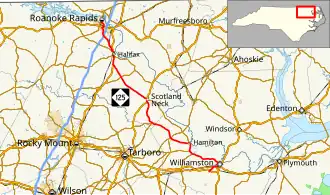 The southern terminus of the route is Martin County SR 1142 (Prison Camp Road) in front of the Senator Bob Martin Eastern Agricultural Center.[3] About 12 mile (0.80 km) north of its interchange with US 13 and US 64, the highway proceeds into the Williamston city limits. After leaving Williamston, NC 125 continues north to serve the small communities of Hamilton, Oak City, Scotland Neck, and Halifax. The highway has an interchange with I-95 shortly before entering its destination town of Roanoke Rapids. The route terminates at NC 48 in the downtown area.