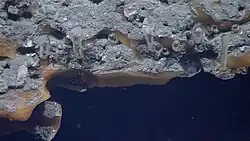 The only macrofauna spotted living directly on methane hydrate outcrops were ice worms, Hesiocaeca methanicola. The ice worms had burrowed into the hydrate, creating small depressions. The worms graze on bacteria growing on the hydrate. Ice worms were also seen in some of the burrows in the surrounding gas hydrate, which appears orange due to impurities. In the image to the right active methane emissions occur from beneath the ledge, through conduits at the base of the inverted droplets attached to the sediment and through a bubble tube at the right of the image. Both the bubble tubes and the inverted droplets are encased in clear gas hydrate.[7]