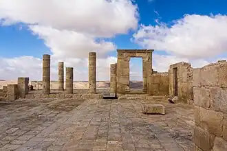 Remains of Byzantine church at Avdat in the Negev, which reused elements of a temple built by the Nabataeans to commemorate king Obodas I and his victories against the Hasmoneans and the Seleucids