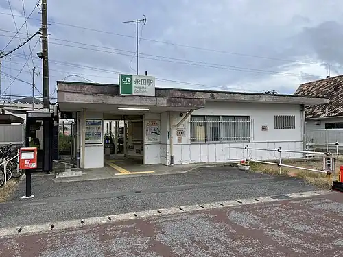 Nagata Station has a two opposed side platforms connected to a one-story station building by a footbridge. Unattended for many years, the station has been attended during normal working hours since April 1996.