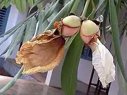 The fruit is a capsule, usually globule, often beaked, thinly woody, usually dehiscing with two to four valves before falling, often exuding resinous droplets. One fruit contains one to four seeds. Fruits are reddish, conical hard and ovoid. The fruit diameter is 3.0" and nearly woody. Fruits are ovoid, 2.5–5 cm (1.0–2.0 in) long with persistent calyx. The seeds are dark brown fleshy oily cotyledons.[5] Fruits weigh from 50–60 g (1.8–2.1 oz) each.[6]