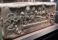 Left: Liao dynasty polychrome statue of Sakyamuni from the Mentougou Museum, on loan to the Capital Museum. Above: A stone chest for storing śarīra (Buddhist relics), unearthed in Chaoyang District, now in the Capital Museum.