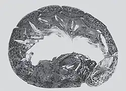 It is most well known because when stranded by a low tide the 3 cm stomatopod lies on its back and performs backwards somersaults over and over. The animal moves up to 2 meters at a time by rolling 20-40 times, with speeds of around 72 revolutions per minute - 1.5 body lengths per second (3.5 cm/s). Researchers estimate that the stomatopod acts as a true wheel around 40% of the time during this series of rolls. The remaining 60% of the time it has to "jumpstart" a roll by using its body to thrust itself upwards and forwards.[1][2][3]