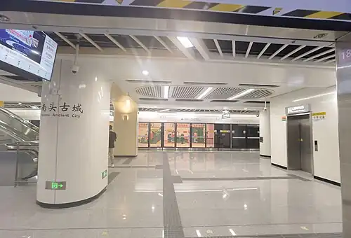 Nantou Ancient City station (simplified Chinese: 南头古城; traditional Chinese: 南頭古城; pinyin: Nántóu Gǔchéng; Jyutping: Namm4 Tau4 Gu2 Sing4) is a metro station on Line 12 of Shenzhen Metro.[1] It opened on 28 November 2022.[2][3]
