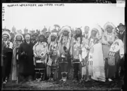In 1908 and 1909, Joseph K. Dixon led two 'expeditions', sponsored by Rodman Wanamaker, wealthy from his involvement with the department store Wanamaker's, to visit Native American tribes as part of increasing white American interest in Native culture and efforts to "assimilate" the tribes into white American society.[1][2] The first expedition, which travelled to Crow Agency, Montana, in 1908, saw Dixon carefully direct filming and photographs in an effort to capture authentic images without "any hint of the white man's foot".[3] The following year Dixon returned to Crow Agency where directed around 100 Native chiefs to film "The Last Great Indian Council" and a reenactment of the Battle of the Little Bighorn.[4]