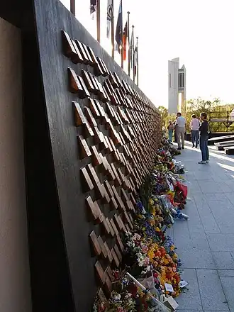 National Police Memorial commemorative wall of 'touchstones' with National Carillon behind. Floral tributes laid at official opening, 29 September 2006.