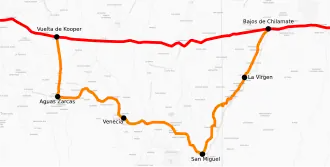 This is a segment planned since 1973, but construction started until 2013 and was opened in August 2017, it directly connects the then two endpoints of Route 4, at Bajos de Chilamate in Heredia province and Vuelta de Kooper in Alajuela province with a road of 27 km, single lane in each direction, and avoids the previous longer journey of 87.32 km which went through Route 126, Route 140, Route 250 and Route 751, and the towns of La Virgen, San Miguel, Venecia and Aguas Zarcas. This last segment finally concludes the construction of the originally planned Route 4.[3]