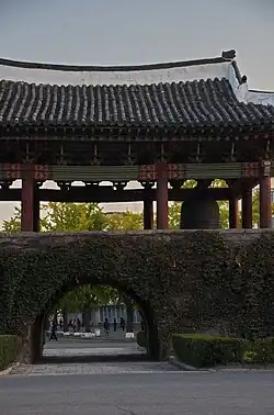 1. ^ 監査院「国宝1号を変更すべき」 (in Japanese). Chosun Ilbo Japan. 2005-11-08. Archived from the original on 2008-02-15. Retrieved 2008-01-07. 監査院は「日帝は1938年の『朝鮮宝物令』で文化財を指定した際、南大門を宝物1号に、現在の東大門(現在の宝物1号)を宝物2号に指定したが、光復 (独立)後も1962年にようやく国宝と宝物を指定した際、そのほとんどが日帝の宝物令にそのまま従って指定された」と明らかにした。