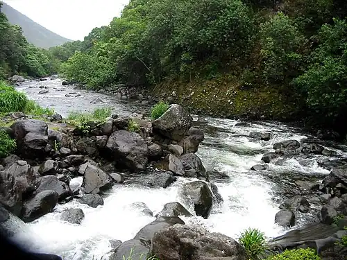 A river is a natural watercourse,[7] usually freshwater, flowing toward an ocean, a lake, a sea or another river. A few rivers simply flow into the ground and dry up completely without reaching another body of water.