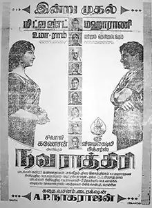 Navarathri (transl.Nine nights) is a 1964 Indian Tamil-language drama film written, produced and directed by A. P. Nagarajan. The film stars Sivaji Ganesan and Savithri. It was the hundredth film of Ganesan and is well known for his nine distinct roles.[1] The film, released on 3 November 1964, become a box-office hit, with theatrical run of 100 days.[2][3] It was remade in Telugu as Navaratri (1966) and in Hindi as Naya Din Nai Raat (1974).