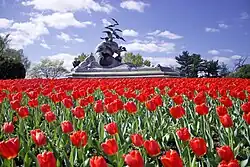 Congress did not appropriate funding to implement the original vision of sea-green granite steps surrounding the monument. The rough concrete base was instead finished with flagstone by the Civilian Conservation Corps under the Works Progress Administration who also installed landscaping, a parking lot and walking paths. Work was somewhat delayed by a shortage of labor caused by America's entry into World War II.[23] The CCC installed tile drains around the walkway. Yews were chosen for planting around the monument because their blue-green foliage would somewhat compensate for the originally planned granite steps designed to evoke waves. The flower beds were not installed at this time and were added at some later point.[24] Today the monument is landscaped with red tulips in the spring and red cannas in the fall.