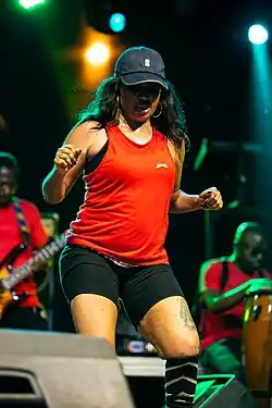 Musically, ndombolo typically features lead and backing vocalists, electric guitars, drum kits, synthesized and digital sounds, along with the atalaku—a master of ceremonies whose energetic chants and exhortations are central to the performance.[8][12][13] Thematically, the lyrics often explore themes of human relations, marriage, courtship, trickery, disappointment, and Congolese sociopolitical culture.[14][15][16] The accompanying dance style is marked by vigorous hip movements, synchronized leg and arm gestures, and a sensual performance style.[8] The sebene serves as the genre's high-energy centerpiece, often overlaid with the atalaku's improvisational vocalizations. These impassioned vocalizations, often delivered in a frenetic and semi-improvised style, serve to elevate the intensity of the performance and incite greater engagement, creativity, and movement among dancers.[8]