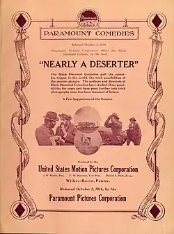 Nearly a Deserter is a 1916 American short silent comedy film produced by the United States Motion Picture Corporation under the Black Diamond Comedy name. The film was the first Black Diamond Comedy distributed by the Paramount Pictures, and was produced in a studio based in Wilkes-Barre.[1]