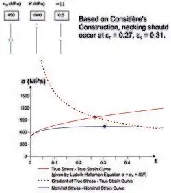 This condition can also be seen in the two figures. Since many stress-strain curves are presented as nominal plots, and this is a simple condition that can be identified by visual inspection, it is in many ways the easiest criterion to use to establish the onset of necking. It also corresponds to the “strength” (ultimate tensile stress), at least for metals that do neck (which covers the majority of “engineering” metals). On the other hand, the peak in a nominal stress-strain curve is commonly a fairly flat plateau, rather than a sharp maximum, so accurate assessment of the strain at the onset of necking may be difficult. Nevertheless, this strain is a meaningful indication of the “ductility” of the metal – more so than the commonly used “nominal strain at fracture”, which depends on the aspect ratio of the gauge length of the tensile test-piece[3] – see the article on ductility.