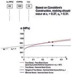 with the T subscript being used to emphasize that these stresses and strains must be true values. Necking is thus predicted to start when the slope of the true stress / true strain curve falls to a value equal to the true stress at that point.