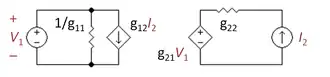 An alternative view is that the voltage at the top of R2 is set by the emitter current of the output transistor. That view leads to an entirely passive feedback network made up of R2 and Rf. The variable controlling the feedback is the emitter current, so the feedback is a current-controlled current source (CCCS). We search through the four available two-port networks and find the only one with a CCCS is the g-parameter two-port, shown in Figure 4. The next task is to select the g-parameters so that the two-port of Figure 4 is electrically equivalent to the L-section made up of R2 and Rf. That selection is an algebraic procedure made most simply by looking at two individual cases: the case with V1 = 0, which makes the VCVS on the right side of the two-port a short-circuit; and the case with I2 = 0. which makes the CCCS on the left side an open circuit. The algebra in these two cases is simple, much easier than solving for all variables at once. The choice of g-parameters that make the two-port and the L-section behave the same way are shown in the table below.