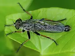 Neomochtherus geniculatus can reach a body length of about 9–20 millimetres (0.35–0.79 in).[3][4][5] These robber flies have a small facial gibbosity with a few bristles forming the mystax. Sternites are predominantly shiny. Femora are black. The widest point of the distinctly broadened hypopygium is in the middle.[6]