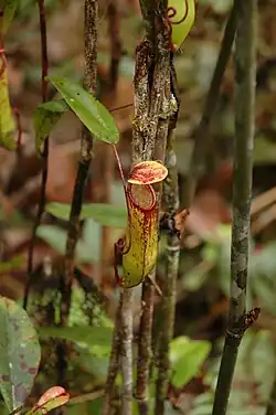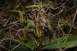 Nepenthes muluensis × N. tentaculata was described as N. × sarawakiensis in 1993 by J. H. Adam, C. C. Wilcock, and M. D. Swaine.[24] The authors distinguished the taxon from N. muluensis on the basis of its branched spur and the presence of fringe hairs on the top of the lid. They also compared the distribution of phenolic compounds in the leaves of N. muluensis and the hybrid, although they did so without specifying the number of plants studied or the number of repetitions performed.[6] As a result, doubts have been raised over the existence of this hybrid.[25] Charles Clarke writes that the authors described N. × sarawakiensis "in such a way that their work cannot be easily repeated".[6] Although this natural hybrid is likely to exist, it is possible that N. × sarawakiensis was described based on specimens of N. muluensis with lower pitchers.[6]