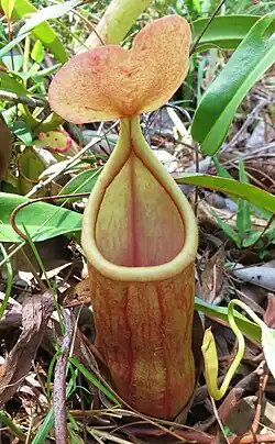 Nepenthes rosea is a tropical pitcher plant known only from Krabi Province, Peninsular Thailand, where it grows at 450–520 m above sea level.[1] Nepenthes rosea got its name from their pitchers which often have uniformly pink interiors.[1] It has been seen growing in sand and humus in varying proportions, on both vertical and flat ground in clearings, scrubland, and open forests.[1] Nepenthes rosea was formally described by Marcello Catalano and Trongtham Kruetreepradit in December 2014.[2] It is unusual in that it sometimes produces a rosette along the peduncle.[1] Nepenthes rosea belongs to the N. thorelii aggregate.[1]