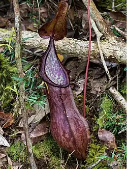 The describing authors wrote that, based on its pitcher morphology, N. talaandig "is not directly related to any other Philippine species", though they suggested it might belong to the large "N. alata group".[1] This complex includes N. alata, N. ceciliae, N. copelandii, N. cornuta, N. extincta, N. graciliflora, N. hamiguitanensis, N. kitanglad, N. kurata, N. leyte, N. mindanaoensis, N. negros, N. ramos, N. saranganiensis, and N. ultra.[1][2][3][4][5] These species are united by a number of morphological characters, including winged petioles, lids with basal ridges on the lower surface (often elaborated into appendages), and upper pitchers that are usually broadest near the base.[2][3]