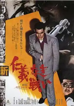 New Battles Without Honor and Humanity (Japanese: 新仁義なき戦い, Hepburn: Shin Jingi Naki Tatakai) is a 1974 Japanese yakuza film directed by Kinji Fukasaku.[2] It begins a new series of films with unrelated plots, based on the director's earlier Battles Without Honor and Humanity pentalogy. New Battles Without Honor and Humanity: The Boss's Head followed in 1975 and New Battles Without Honor and Humanity: Last Days of the Boss in 1976.[3]