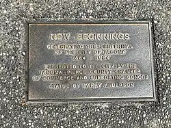 Larry Anderson's bronze sculpture New Beginnings is installed on Pacific Avenue outside Union Station in downtown Tacoma.[2][3] The artwork depicts a man arriving in the city and wearing a bowler hat.[4][5] It has also been described as "an historical representation of individuals of entrepreneurial spirit".[6]