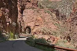 The road through the Rio Guadalupe box canyon bears the designation Forest Road 376 in Santa Fe National Forest near the unincorporated town of Cañones (or Gilman). The continuation as Forest Road 376 eventually terminates at New Mexico State Road 126 east of San Pedro Parks Wilderness. The route incorporates the Gilman Tunnels (1 mi (1.6 km) beyond the transition to Forest Road 376) which was part of the former Santa Fe Northwestern Railway (SFNW) through the canyon which was used to haul lumber from the Jemez Mountains. The railway opened in 1924 but never recovered financially from the Wall Street crash of 1929,[3] and ceased operations in May 1941 following flood damage from the Rio Guadalupe.[4]