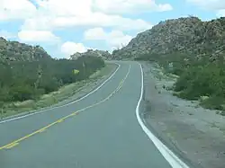 Despite being an even-numbered highway, NM 80 is signed as a north–south route.[2] This is because NM 80 takes its number from the now-defunct US 80, which was an east–west highway, as well as the fact that the highway continues as SR 80 into Arizona.[3] NM 80 begins at the Arizona state line and eastern terminus of Arizona State Route 80. The highway travels northeast alongside the town of Rodeo.[2] On the north side of the highway is the now abandoned track bed of the former El Paso and Southwestern Railroad. On the northeast end of town at Shady Lane, Rivers Road curves off to the northeast. This older section of US 80 used to lead to a railroad overpass, when the EP&SW was still operational. After the line was abandoned, US 80, now NM 80, was rerouted to a gentle curve bisecting the old track bed.[3] The old overpass has long since been demolished. NM 80 travels straight north from this point on.[2]