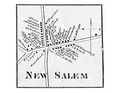 The area of New Salem was first settled as farmland around 1770 and soon the Beaverdam Road was established through the future hamlet.[1] Legend has it that the original name of the hamlet, Punkintown, was because a sow and her litter were able to live inside a "punkin" (pumpkin) since the pumpkins grown in the area grew so large.[2] When the post office was established here in 1830 the name New Salem was used.[1][3]