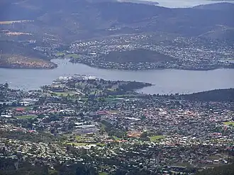 New Town viewed from Lost World to the west. New Town Bay is on the left and Cornelian Bay is on the right behind the suburb.