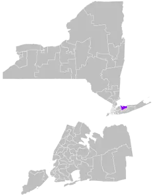 The district overlaps with New York's 1st and 3rd congressional districts, and with the 3rd, 4th, 5th, 8th, 10th, and 12th districts of the New York State Assembly.[5]