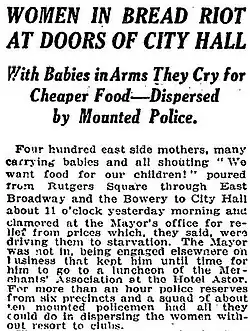 1. ^ "Women in Bread Riot At Doors of City Hall. With Babies in Arms They Cry for Cheaper Food. Dispersed by Mounted Police. Police Fail to Break Rush. Mrs. Harris Makes Speech. Marie Ganz Arrested" (PDF). New York Times. February 21, 1917. Retrieved February 13, 2015. Four hundred east side mothers, many Carrying babies and all shouting 'We want food for our children!' poured from Rutgers Square through East Broadway and the Bowery to City Hall about 11 o'clock yesterday morning and ...