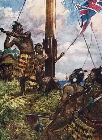 After the signing of the Treaty of Waitangi, the Union Jack was used, although the former United Tribes flag was still used by a number of ships from New Zealand and in many cases on land. The New Zealand Company settlement at Wellington, for example, continued to use the United Tribes flag until Governor William Hobson sent a small armed force to Wellington in May 1840 (following his declaration of British sovereignty).[19][20][21] The Union Jack, as a symbol of British authority, became the focus of the Flagstaff War which began in 1844, marking (according to some historians) the start of the New Zealand Wars.