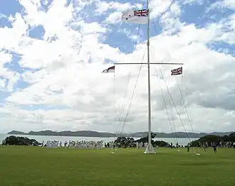 The flag pole at Waitangi, flying (left – right) the Flag of the United Tribes of New Zealand, the Ensign of the Royal New Zealand Navy and the Union Jack, 5 February 2006