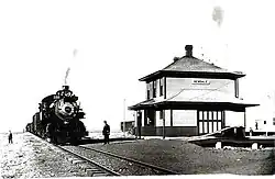 Sam and Fred Schwendiman incorporated the Newdale Investment Company for commercial purposes, which erected a rock building that housed, on the ground floor, a hardware supply and drug store. The other part of the building was leased to the First National Bank of Newdale, an independent bank managed by G.C. Alden. Upstairs, a fine recreation hall was completed for dancing, with a stage where operettas and drama productions could be given. The facility formally opened in June 1915 and attracted considerable attention at the time. A train depot was also built in 1915, and catered to both freight and passenger service. Later that summer, in August, a group of men representing the Chamber of Commerce came to Newdale by train and were entertained at this community center before making the loop back to Idaho Falls.