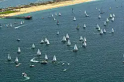 Historically, the starting point was close to the Newport Harbor entrance in Corona Del Mar but thanks in part to the heavy boat traffic at the harbor mouth, the starting line was re-positioned some years ago to just offshore of the Balboa Pier on the Balboa Peninsula.