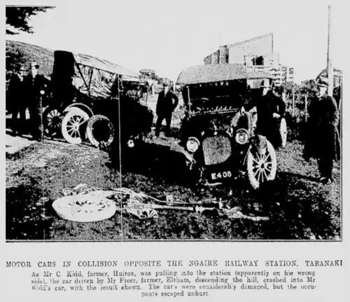 Ngaere Railway Station as seen in 1918, with the scene of a motor accident in the foreground.