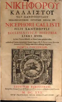 Nikephoros Kallistos Xanthopoulos (Greek: Νικηφόρος Κάλλιστος Ξανθόπουλος; Latinized as Nicephorus Callistus Xanthopulus;[1] c. 1256 – 1335) was a Greek ecclesiastical historian and litterateur of the late Byzantine Empire.[2] His most popular work, the voluminous Ecclesiastica historia, constitutes a significant documentary source on primitive Christianity and its doctrinal controversies, as well as for hagiographical, liturgical, and legendary texts from Byzantine culture.[3]